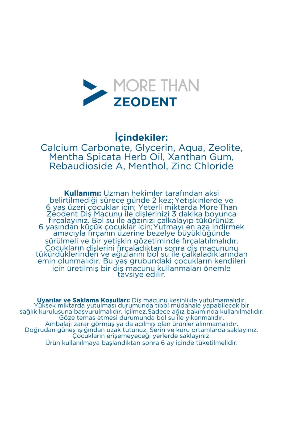 More Than Zeodent 100 gr İçindekiler: Calciumcarbonate, Glycerin, Aqua zeolite, Mentha SpicataHerb Oil, Xanthan Gum, Rebaudioside A, Menthol, Zinc Chloride.. Kullanım Bilgisi Uzman hekimlerce aksi belirtilmedikçe günde 2 defa